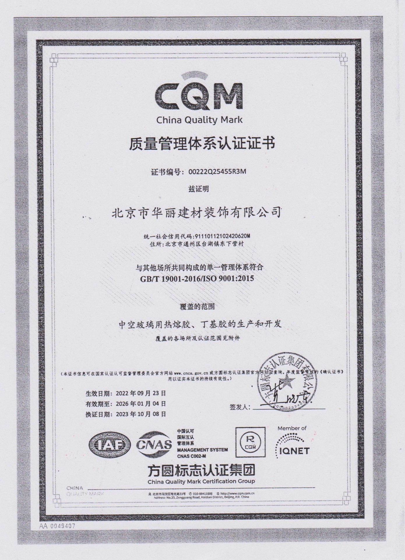 ISO9001:2015質(zhì)量管理體系認證證書